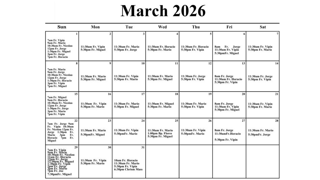 Sunday, March 22, includes Masses at 7:00 am with Fr. Jorge, 9:00 am with Fr. Vipin, 10:30 am with Fr. Nicolau, 12:00 pm with Fr. Jorge, 1:30 pm with Fr. Mario, 3:00 pm with Fr. Horacio, and 7:00 pm with Fr. Miguel. On Monday, March 23, services are at 11:30 am with Fr. Mario and 5:30 pm with Fr. Miguel. Tuesday, March 24, features 11:30 am with Fr. Vipin and 5:30 pm with Fr. Mario. Wednesday, March 25, includes an 11:30 am Mass with Fr. Mario, a 1:00 pm Mass with Bp. Flores, and a 5:30 pm Mass with Fr. Miguel. Thursday, March 26, has Masses at 11:30 am with Fr. Vipin and 5:30 pm with Fr. Mario. Friday, March 27, schedule includes 8:00 am with Fr. Jorge, 11:30 am with Fr. Horacio, and 5:30 pm with Fr. Vipin. Saturday, March 28, offers 11:30 am with Fr. Mario and 5:30 pm with Fr. Jorge.