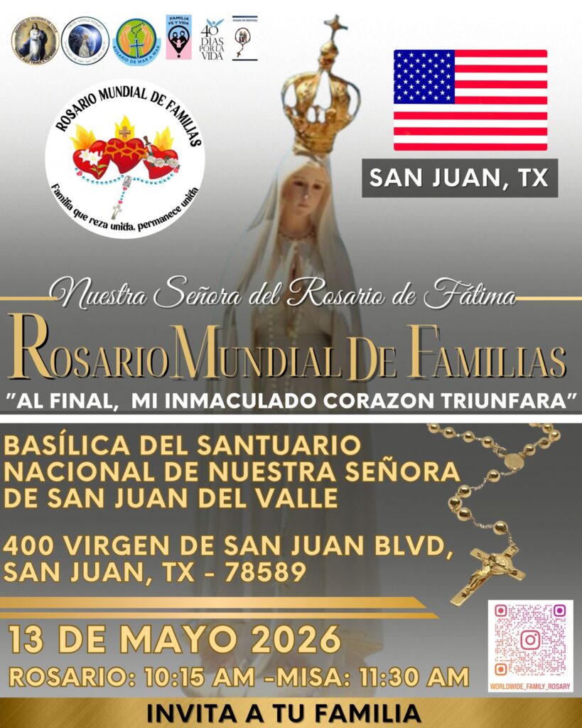 La mañana comenzará con el Rosario a las 10:15 AM, seguido de la Santa Misa a las 11:30 AM. Invitamos a todas las familias a reunirse en la Basílica, ubicada en 400 Virgen de San Juan Blvd, San Juan, TX – 78589, para pedir la intercesión de nuestra Santísima Madre.